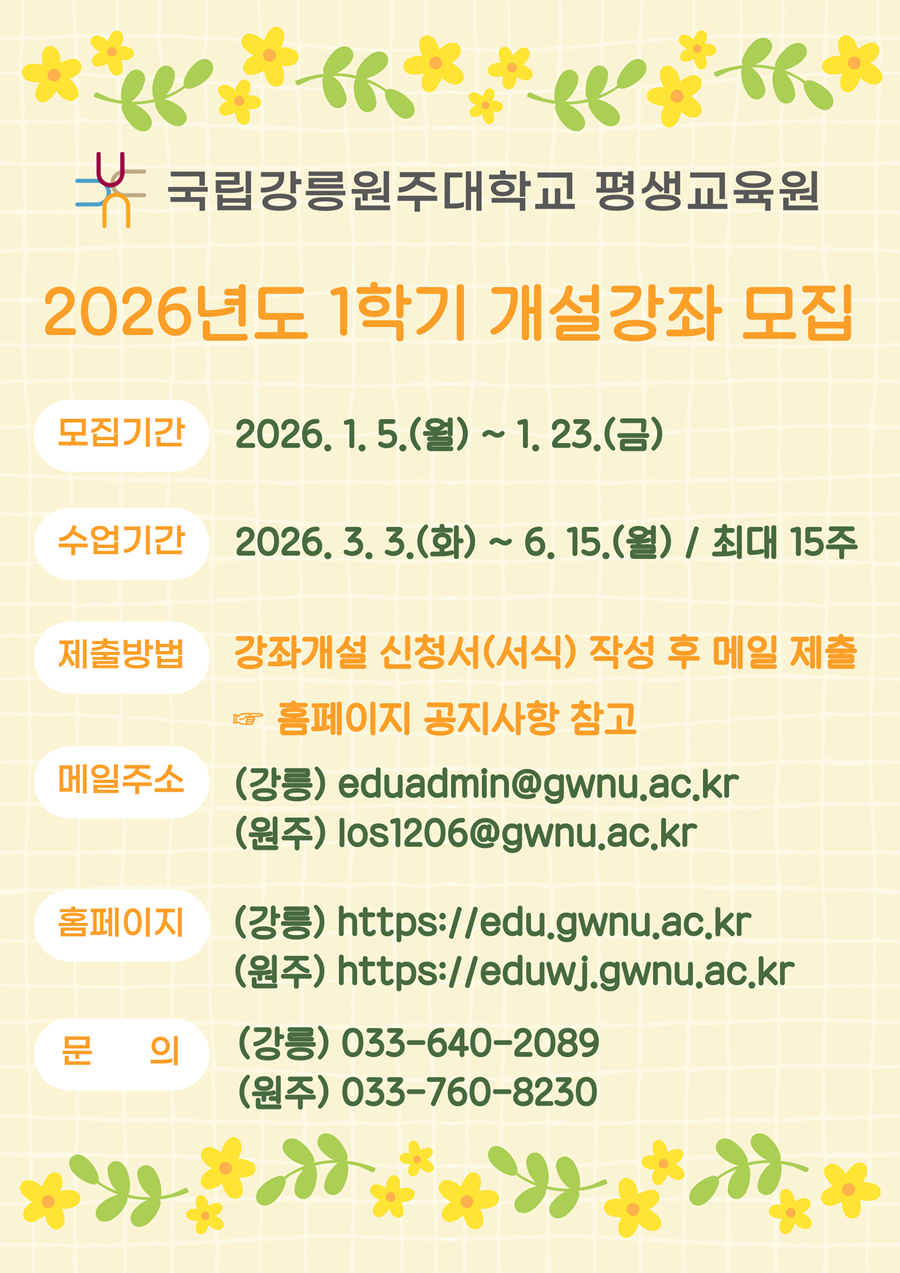 2026년도 1학기 개설강좌를 다음과 같이 모집합니다.