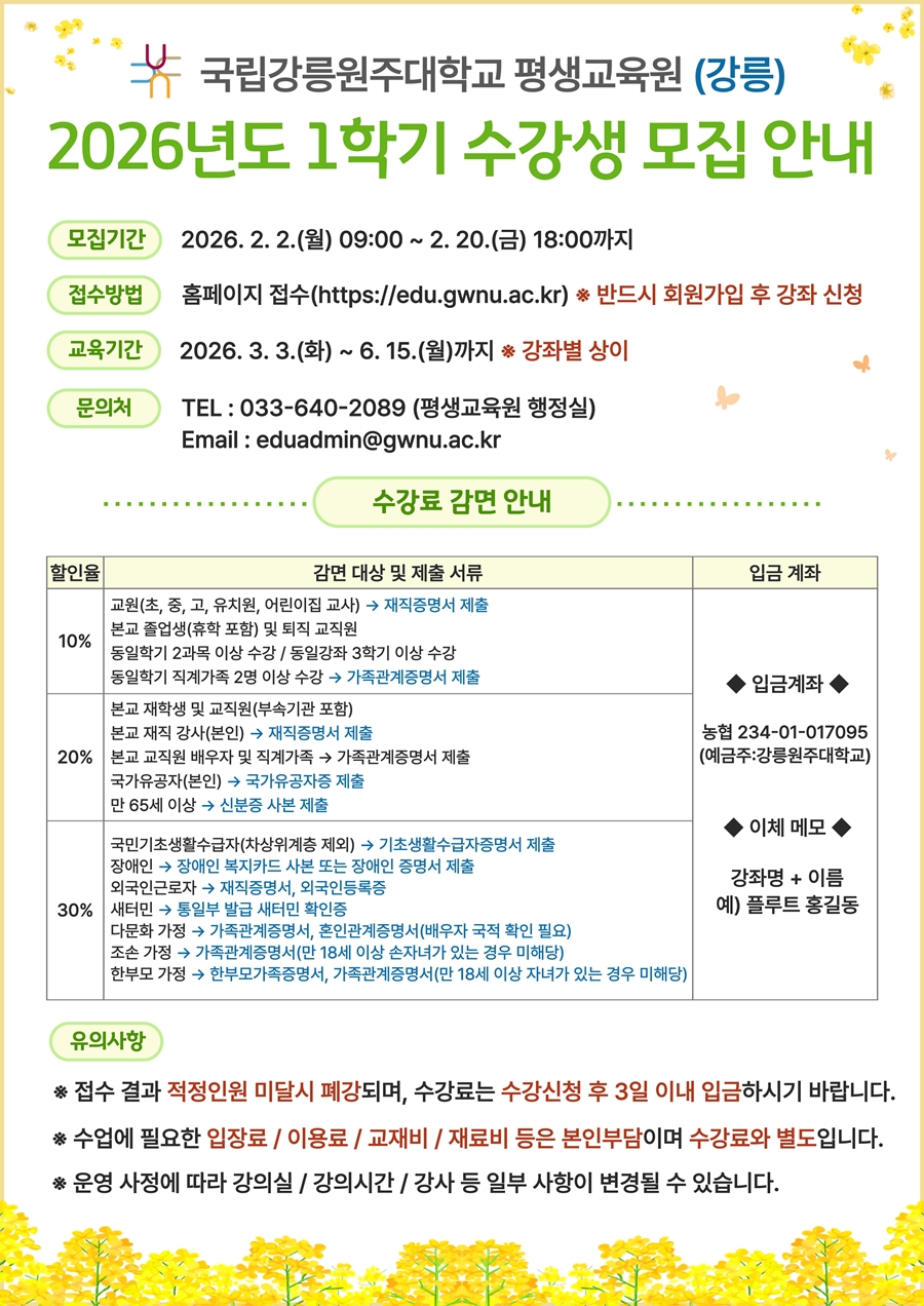 4) 농협 234-01-017095 (예금주 : 강릉원주대학교) 계좌로 3일 이내 수강료를 납부하여야 최종적으로 수강신청 완료